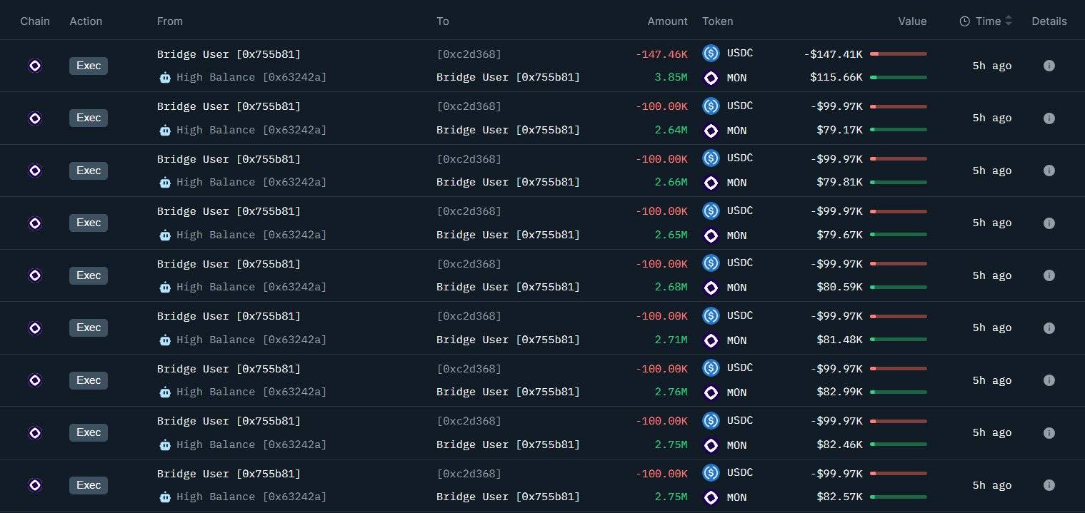 深潮 TechFlow 消息,11 月 25 日,据 Onchain Lens 监测,某巨鲸花费 135 万 USDC 购买了 3700 万枚 MON 代币,购买价格为 0.036 美元。