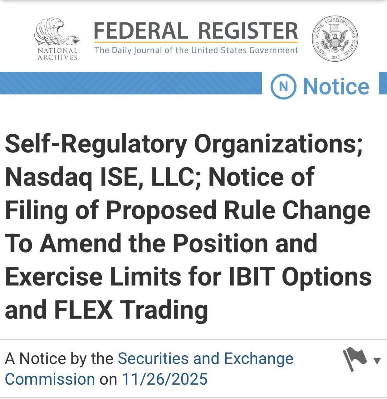 深潮 TechFlow 消息,11 月 27 日,据 Cointelegraph 报道,纳斯达克已向美国证券交易委员会(SEC)提交申请,要求将 BlackRock 的 IBIT 期权限额提升至 100 万份合约,这是监管机构允许的最高水平。