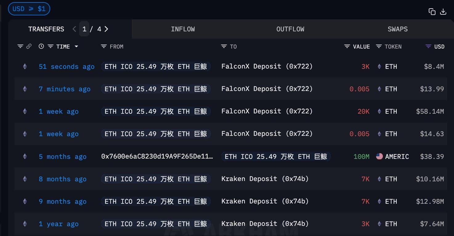 深潮 TechFlow 消息,12 月 2 日,据链上分析师 Ai 姨(@ai_9684xtpa)监测,持有以太坊 ICO 代币 25.49 万枚的远古巨鲸时隔一周再次抛售 3000 枚 ETH,价值 840 万美元。