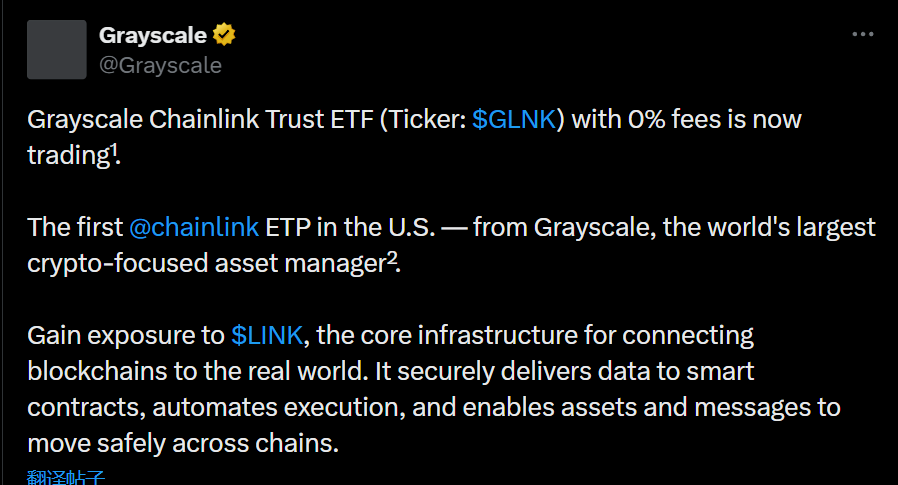 深潮 TechFlow 消息,12 月 2 日,据官方公告,Grayscale Chainlink Trust ETF(代码:GLNK)即将正式上市,管理费为 0%。这是美国首支 Chainlink(LINK)相关的交易所产品(ETP),为投资者提供对 LINK 的敞口。