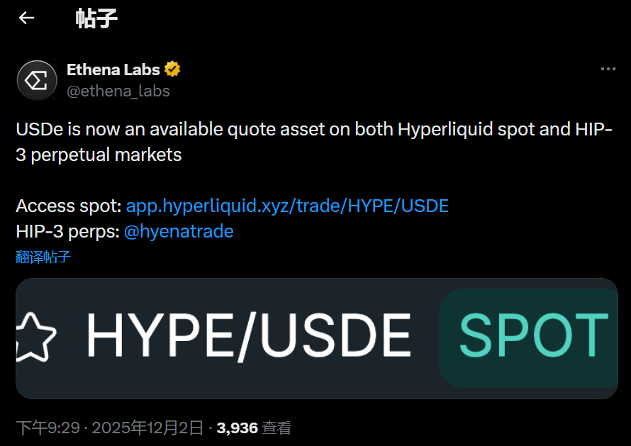 Ethena:USDe 现已成为 Hyperliquid 现货和 HIP-3 永续合约市场可用的计价资产