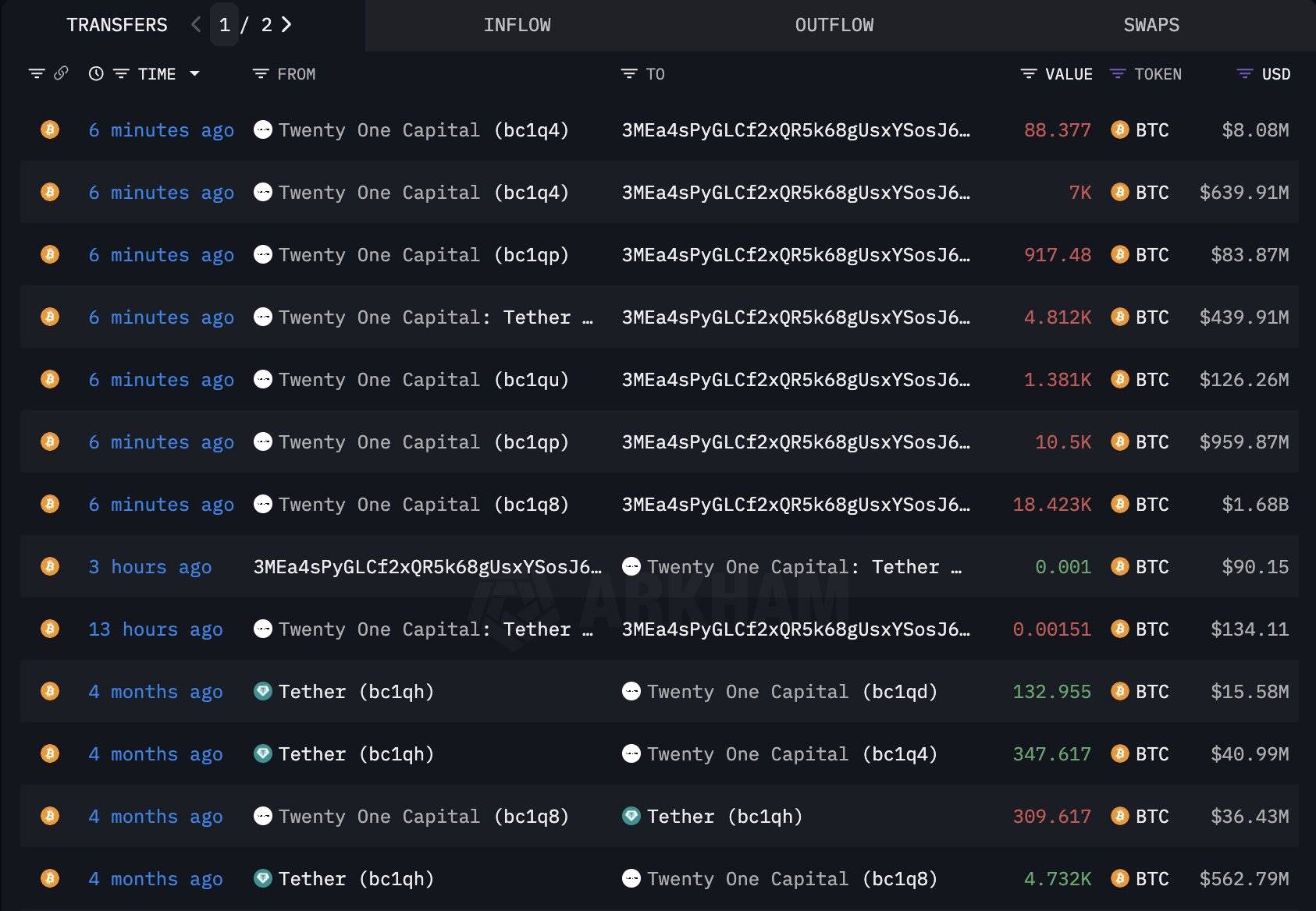 Twenty One Capital 转移 43,122 枚 BTC 至新钱包,价值约 39.4 亿美元