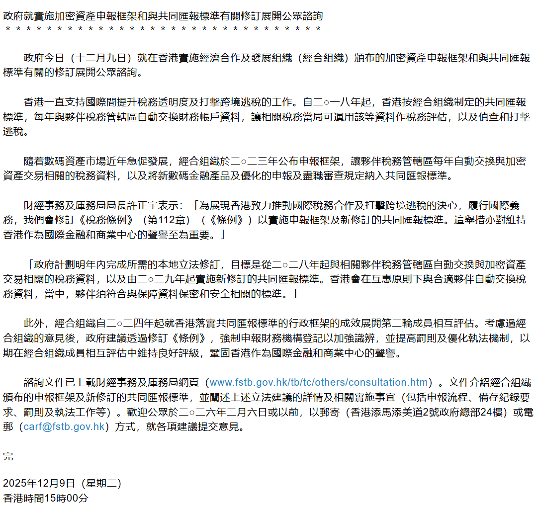 深潮 TechFlow 消息,12 月 9 日,据香港政府新闻公报披露,香港政府就实施经济合作及发展组织(OECD)颁布的加密资产申报框架和共同汇报标准修订展开公众咨询。