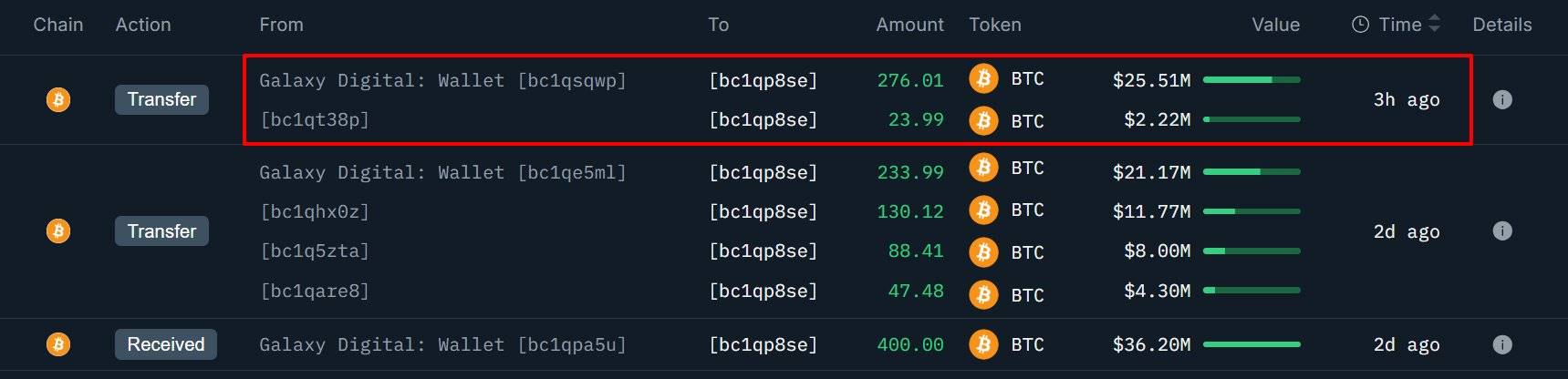 某新建钱包再次从 Galaxy Digital 接收 300 枚 BTC,价值约 2,760 万美元