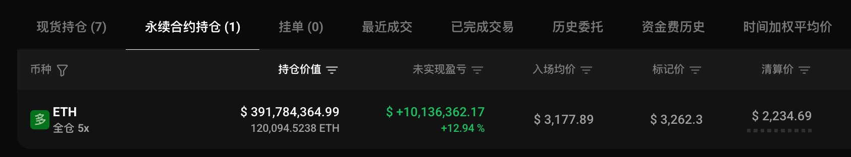 该地址最新持仓达到 120,094.52 枚 ETH,价值 3.92 亿美元,开仓价为 3,177.89 美元,目前浮盈 1,013 万美元。据监测,降息落地后该地址尚未减仓。