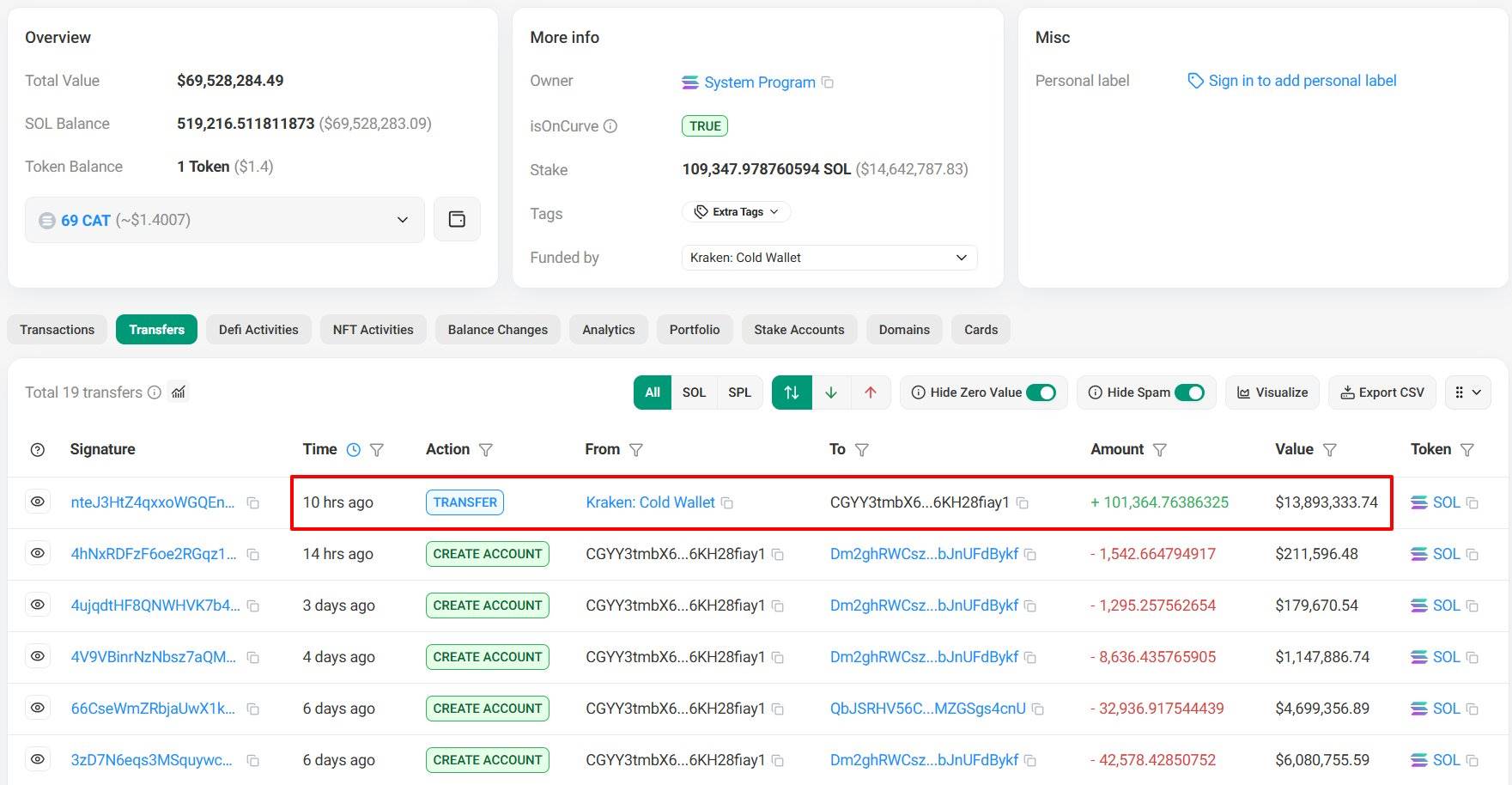 某巨鲸 10 小时前从 Kraken 提取 10.1 万枚 SOL,价值 1389 万美元
