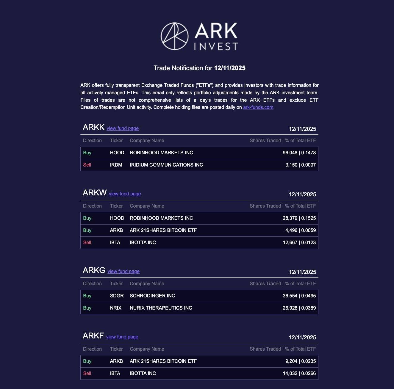 Ark Invest昨日增持 13,700 股比特币现货 ETF ARKB 和超 12 万股 Robinhood