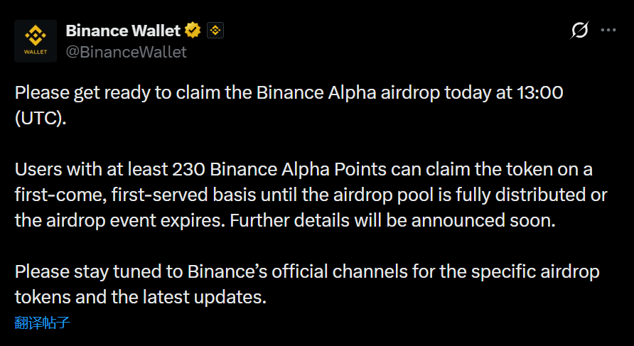 拥有至少 230 个 Alpha 积分的用户可以按先到先得的方式领取代币,直至空投池全部发放完毕或空投活动结束。更多详情即将公布。