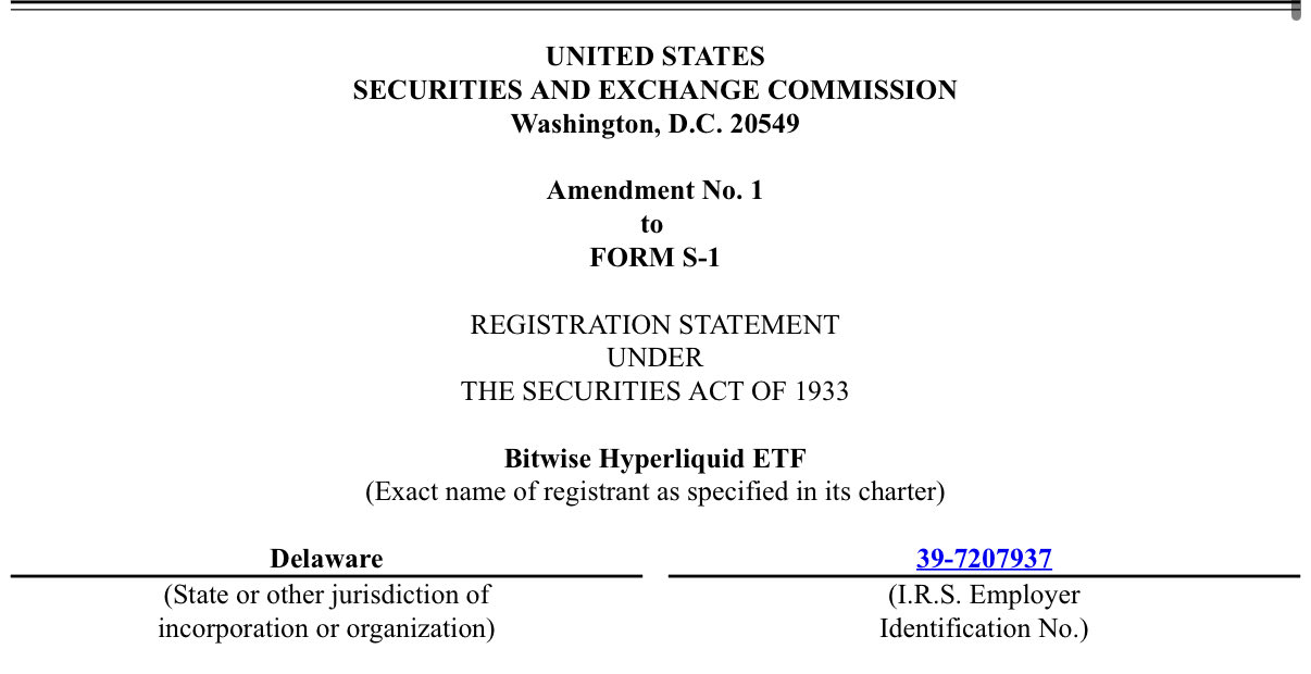 彭博分析师:Bitwise 提交 Hyperliquid ETF 修订文件,或即将推出