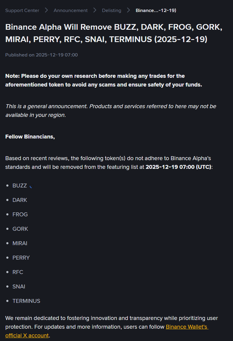深潮 TechFlow 消息,12 月 19 日,据官方公告,Binance Alpha 将移除 BUZZ、DARK、FROG、GORK、MIRAI、PERRY、RFC、SNAI、TERMINUS 币种。