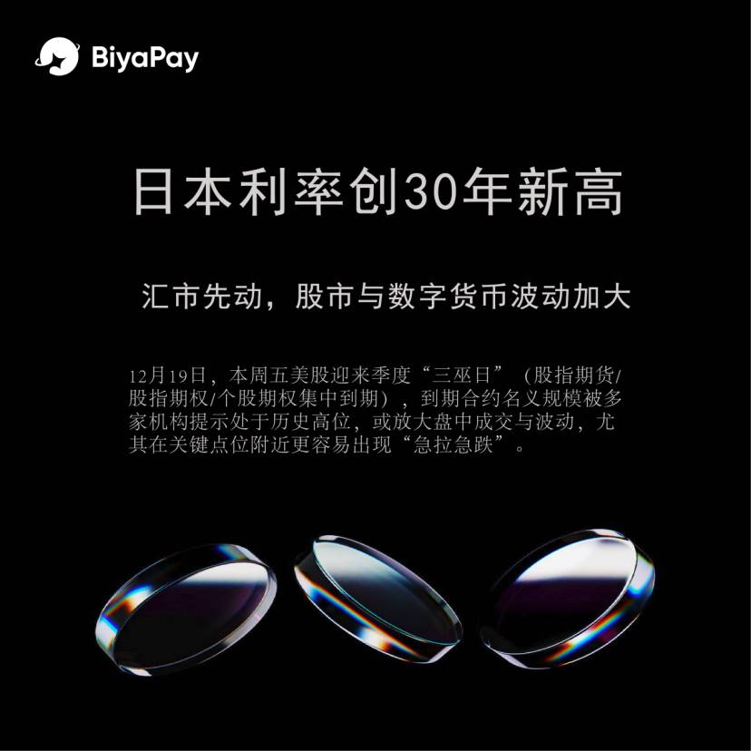 深潮 TechFlow 消息,12月19日,日本央行12月19日如期加息25个基点至0.75%,利率创约30年来新高;同时日本税改草案提及2027年起全收入阶层所得税税率或上调1个百分点。市场短线先交易“日元资金成本上升+风险偏好波动”。对数字货币而言,加息抬高日元融资成本,套息资金若降杠杆、减仓高波动资产,数字货币更易出现急涨急跌、波动放大。BiyaPay分析师认为,关注美元/日元关键点位与美股风险情绪联动,短线以控制杠杆和仓位为主;BiyaPay支持数字货币现货/合约及美股、港股等多资产交易,便于用户按风险偏好动态调整配置。