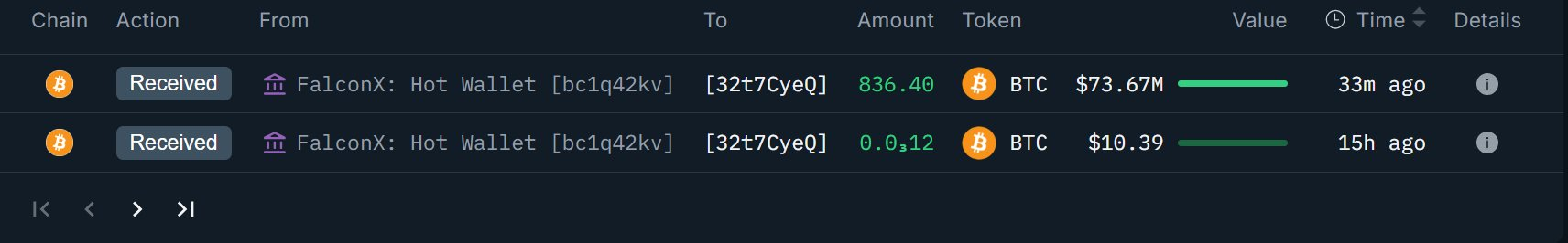 某新建钱包从 FalconX 收到 836.4 枚 BTC,价值 7367 万美元