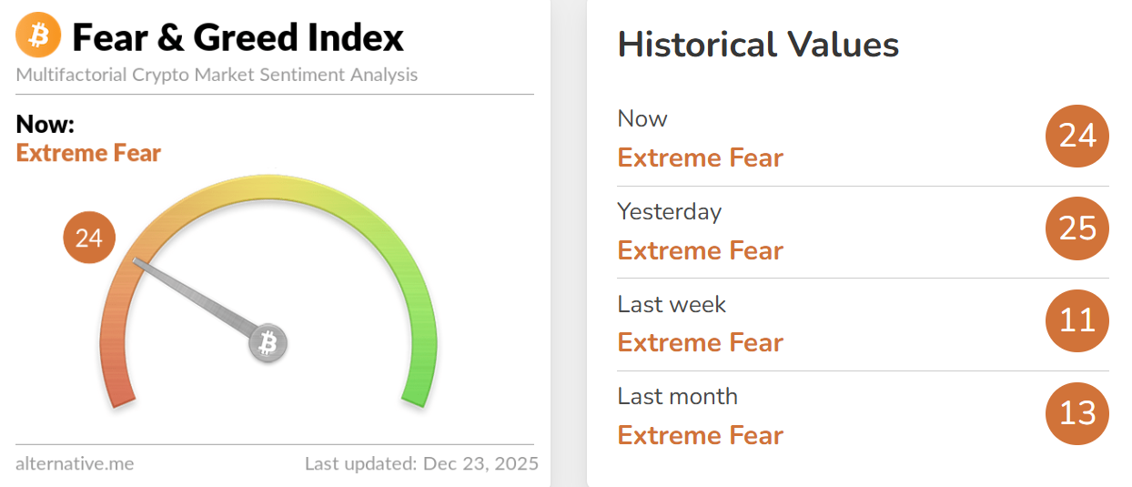 深潮 TechFlow 消息,12 月 23 日,据 Alternative.me 数据,今日加密货币恐慌与贪婪指数降至 24(昨日该指数为 25),表明市场仍处于「极度恐慌状态」。