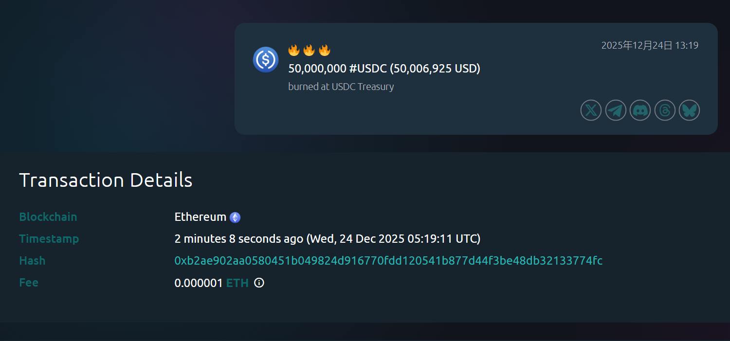深潮 TechFlow 消息,12 月 24 日,据 Whale Alert(@whale_alert)监测, USDC Treasury 约 2 分钟前再次在以太坊链上销毁 5000 万枚 USDC 稳定币。