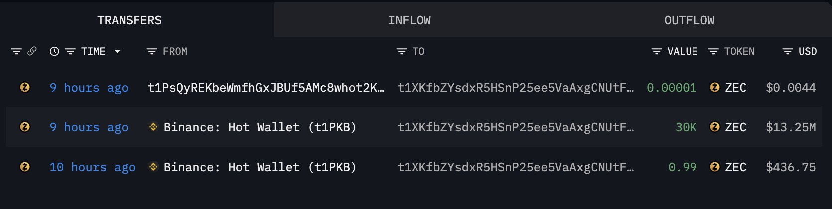 某新建钱包从币安提取价值 1325 万美元的 ZEC