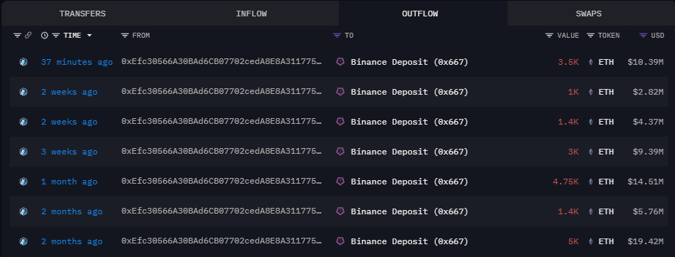 该地址在过去 3 个月内已向 Binance 总计存入 20,050 枚 ETH(约合 6,666 万美元)。