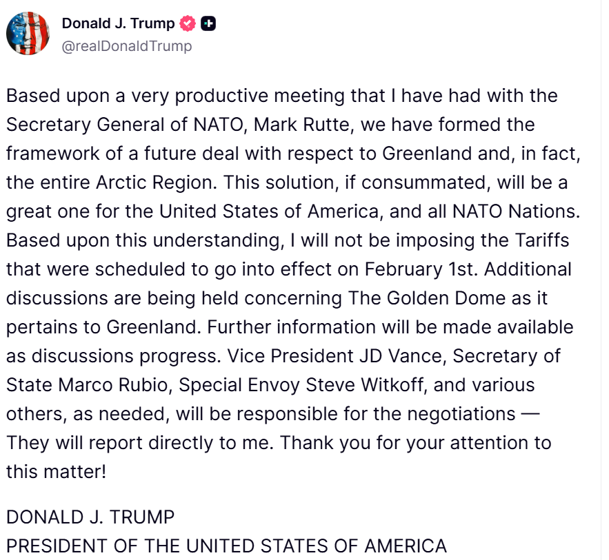 深潮 TechFlow 消息,1 月 22 日,美国总统特朗普今日凌晨在社媒上表示,根据我与北约秘书长马克·吕特进行的一次非常富有成效的会谈,我们已经初步搭建了关于格陵兰岛乃至整个北极地区的未来协议框架。如果该方案最终达成,将对美国及所有北约成员国都是一个重大利好。基于这一理解,我将不会执行原定于2月1日生效的关税。关于格陵兰岛与“金穹”(The Golden Dome)项目,也正在进行进一步讨论。随着谈判的推进,将会提供更多信息。副总统万斯、国务卿鲁比奥、特使威特科夫及其他相关人员将负责此次谈判——他们将直接向我汇报。(金十数据)