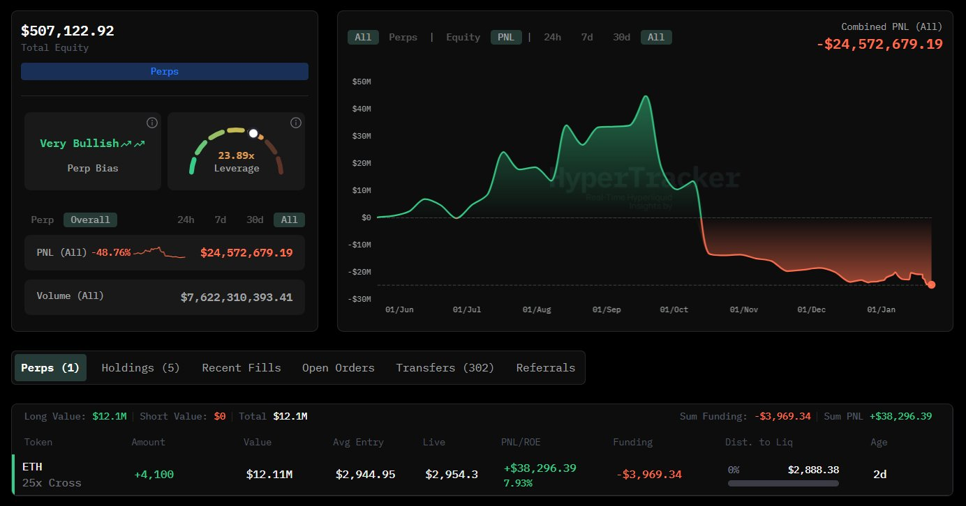 深潮 TechFlow 消息,1 月 23 日,据 Onchain Lens(@OnchainLens)监测,“麻吉大哥”黄立成向 HyperLiquid 协议进一步存入 25 万美元 USDC,并增加了其以太坊(ETH)25 倍杠杆多头仓位。该仓位目前价值 1211 万美元,持有 4100 枚 ETH。