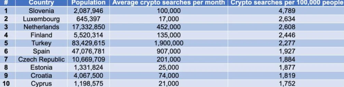 • 斯洛文尼亚每月约有10万次与加密货币相关的搜索,平均每10万人就有4789次搜索,是所有欧洲国家中比例最高的。