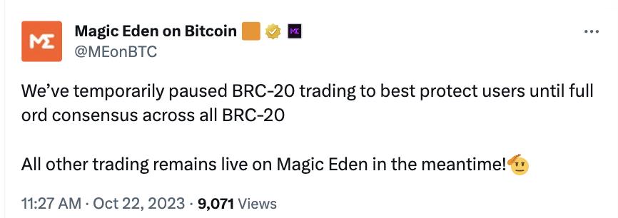 Magic Eden 宣布暂停 BRC-20 交易,直到所有 BRC-20 达成完全共识