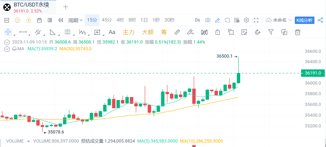BTC 短时触及 36500 美元,24 小时涨幅达 2.52%