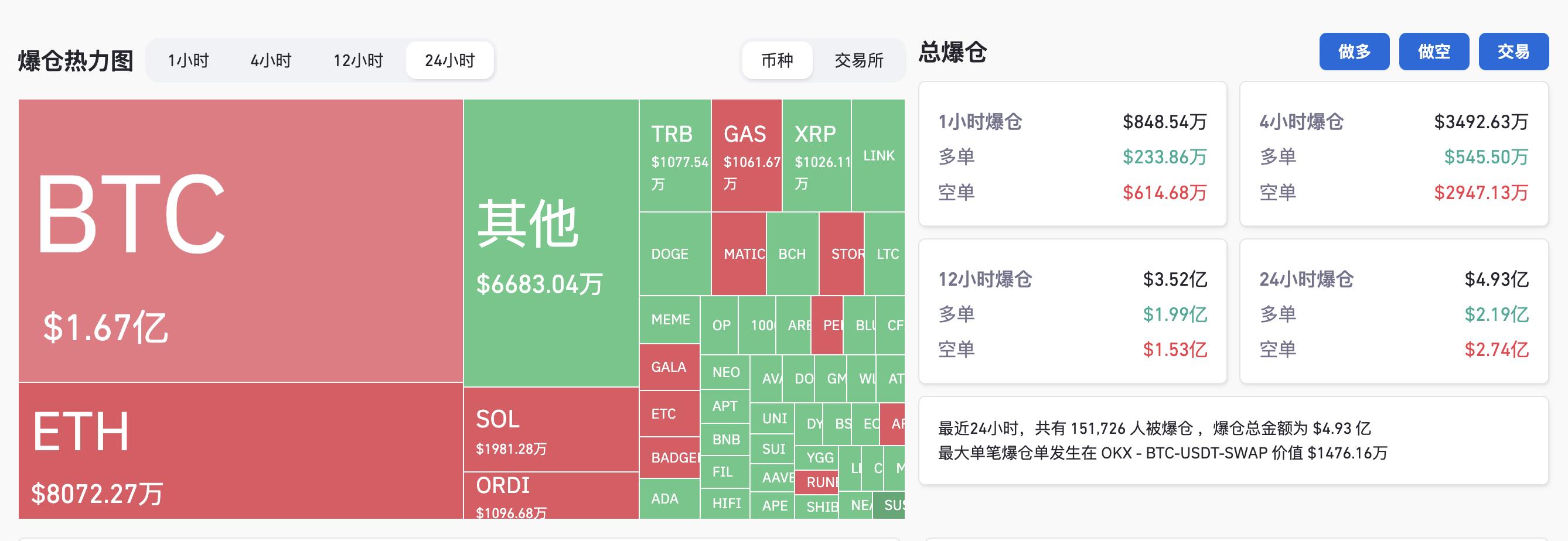 数据:过去 24 小时加密货币市场全网合约爆仓 4.93 亿美元