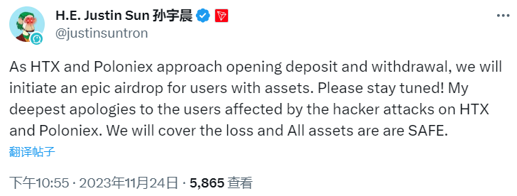 对HTX和Poloniex遭受黑客攻击的受影响用户,我深表歉意。将赔偿损失,所有资产都是安全的。
