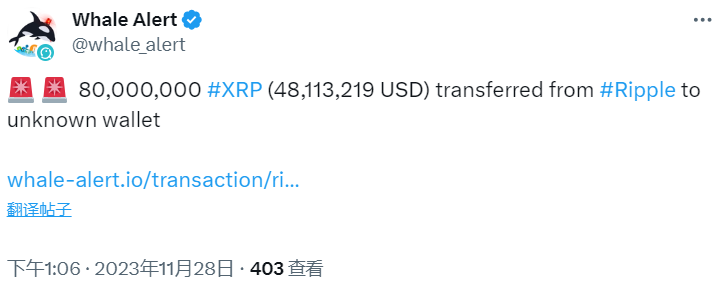 深潮 TechFlow 消息,据Whale Alert监测,8000万枚 XRP (价值 48,113,219 美元) 于北京时间13:16从 Ripple转移至未知钱包。