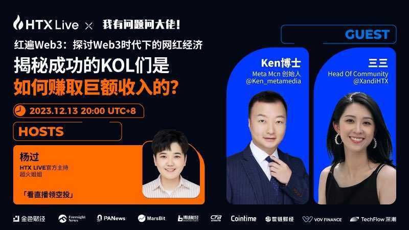 深潮 TechFlow 消息,据火币HTX官方消息,Meta Mcn创始人Ken博士、火币HTX社区负责人三三将于12月13日20时(UTC+8)做客火币直播。本次直播以“揭秘成功的KOL们如何赚取巨额收益”为主题,深入探讨Web3时代下的网红经济。届时,直播间内还将有大量USDT空投福利,敬请期待。