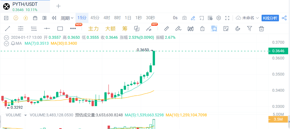 PYTH短时拉升触及0.365美元,24小时涨幅为10.11%