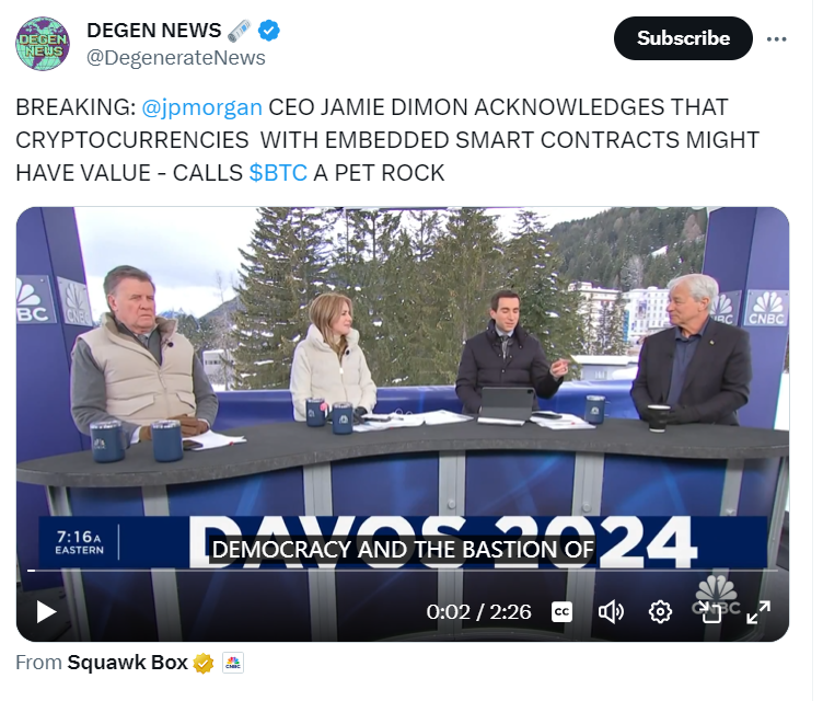 深潮 TechFlow 消息,据DEGEN NEWS 披露的采访视频,摩根大通首席执行官杰米·戴蒙 (JAMIE DIMON) 承认嵌入智能合约的加密货币可能具有价值,但称比特币为”宠物岩石“,因为它”什么也不做“。