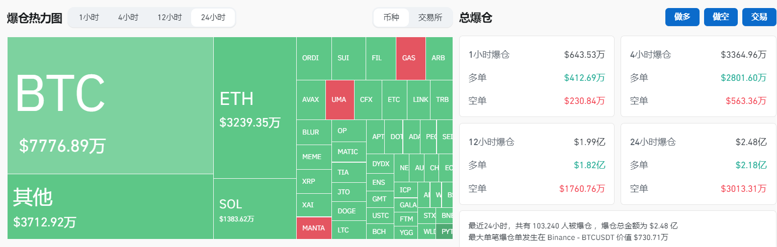 过去24小时全网爆仓2.48亿美元,多单爆仓2.18亿美元