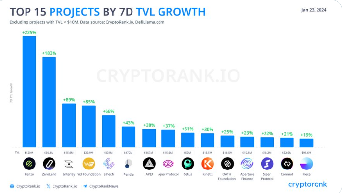 再质押协议Renzo为过去7天TVL增长最多项目,为225%