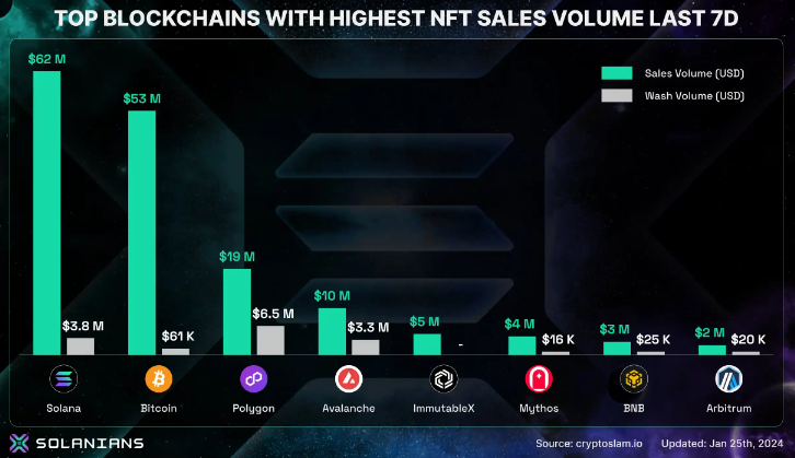 数据:本周Solana NFT销售额达6200万美元,超越比特币网络