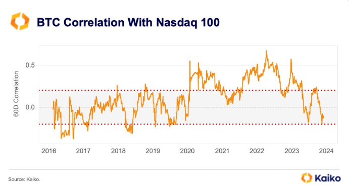 深潮 TechFlow 消息,据 Kaiko 数据,自 2023 年 6 月以来, BTC 与纳斯达克 100 指数的 60 天相关性平均已趋近于0。