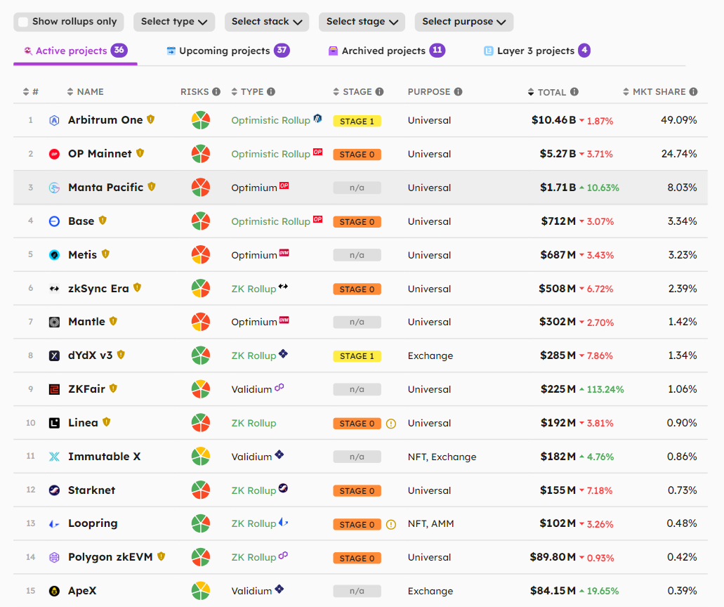 深潮 TechFlow 消息,据 L2beat 数据显示,Manta Pacific TVL 突破 17 亿美元,目前是第三大 Layer2 生态。另据 Analytix 数据,Manta Pacific 链上交易笔数超 1144万,钱包地址 53.7万,活跃地址 51.9万,生态项目部署的已验证智能合约1000个。MANTA 当前报价3.57美元。