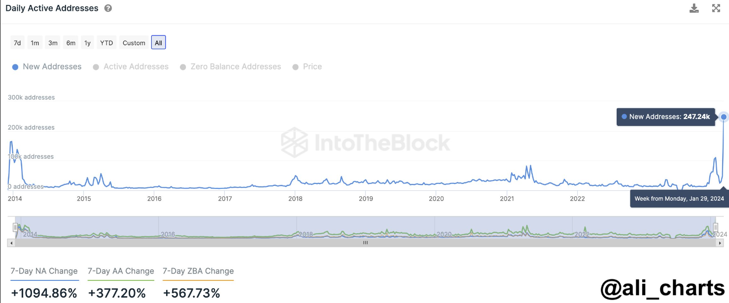深潮 TechFlow 消息,据Ali披露,在过去一周里,Dogecoin网络新地址的增长量达到 1100%。仅 1 月 29 日一天,Dogecoin新地址的创建数量就达到 247240 个,创下历史新高。