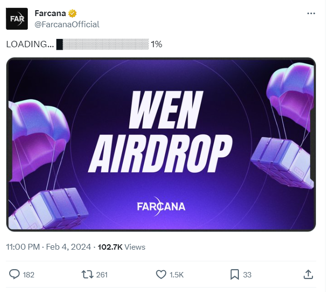 链游工作室Farcana发布图片“WEN AIRDROP”,或将进行空投