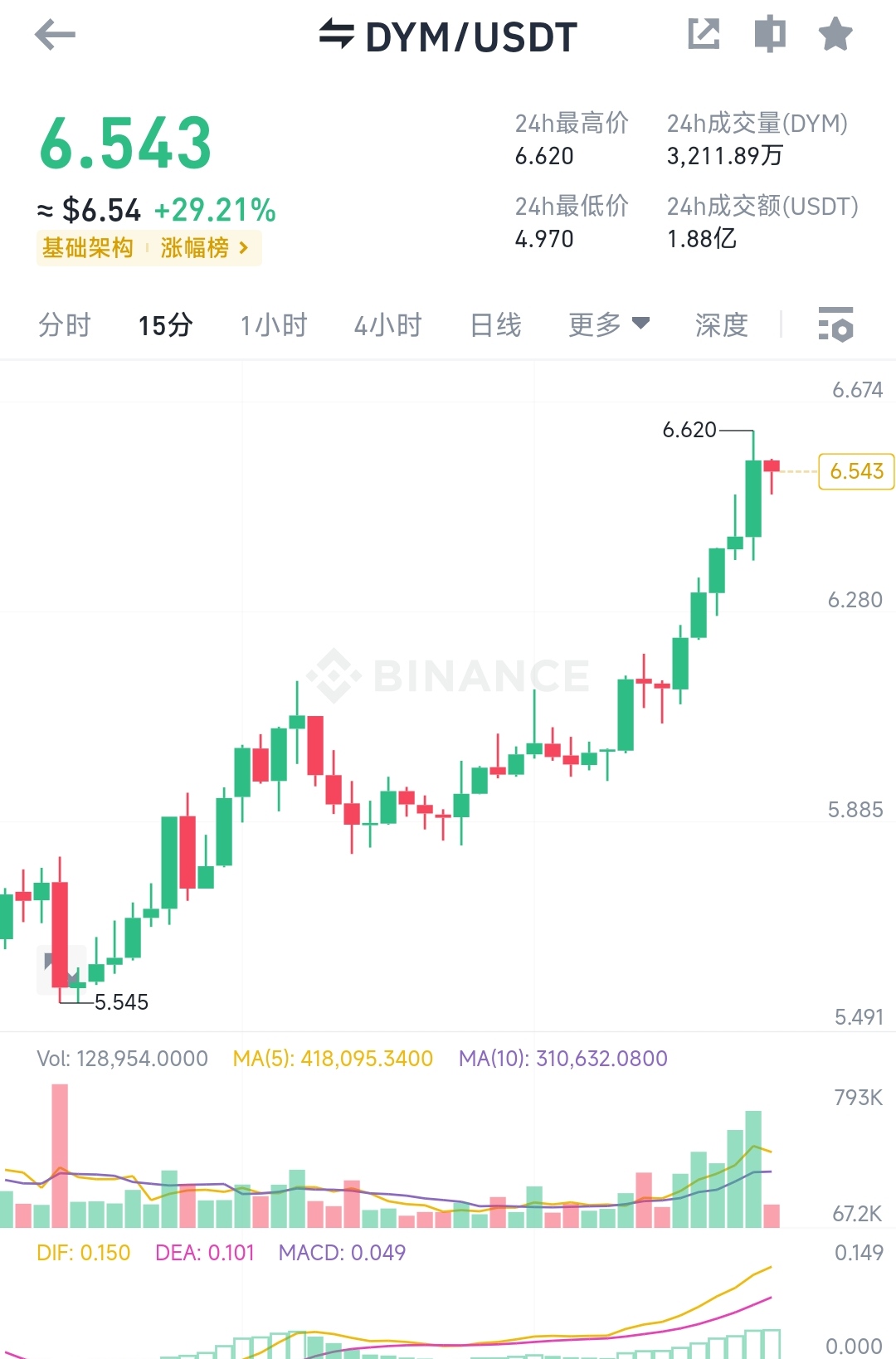 深潮 TechFlow 消息,据币安行情数据显示,DYM短时拉升突破6.6美元,24小时涨幅达29.21%,现报价6.543美元。