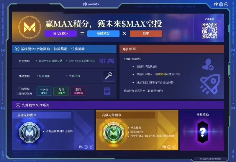 1,每一个参加MAX积分活动的人都可以获得一枚先锋勋章NFT,活动结束后将获得神秘奖励。