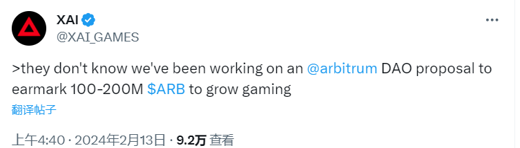 XAI计划发起Arbitrum DAO提案,提议分配1亿至2亿枚ARB来发展游戏