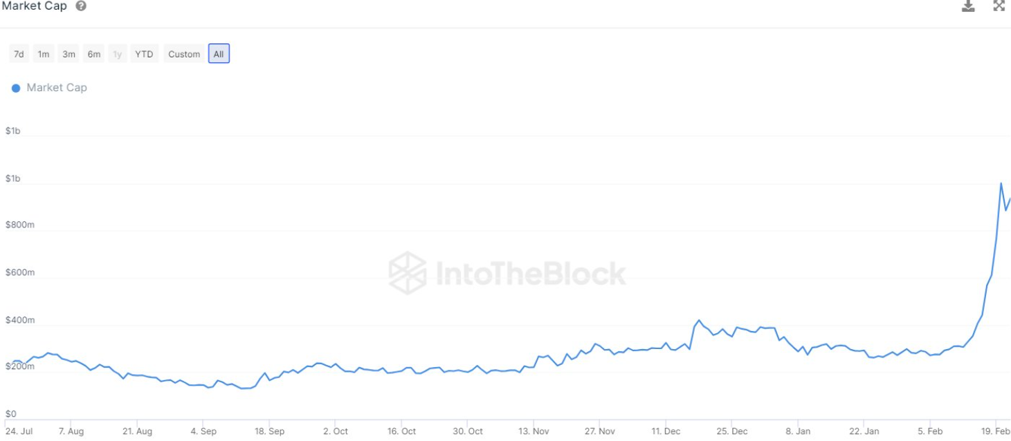 深潮 TechFlow 消息,据IntoTheBlock数据,Worldcoin代币WLD价格过去 14 天内上涨超过 200%,市值达到 10 亿。 WLD的FDV目前约为810亿美元,超过OpenAI。
