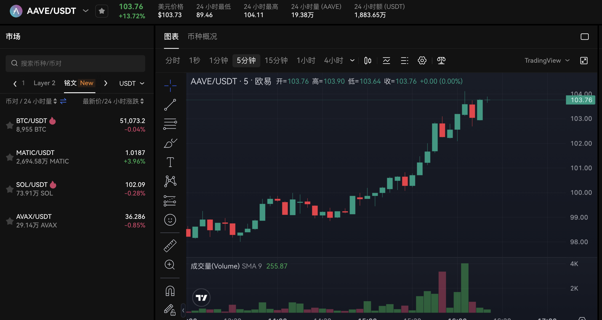 AAVE 突破 103 USDT,24 小时涨幅 13.72%