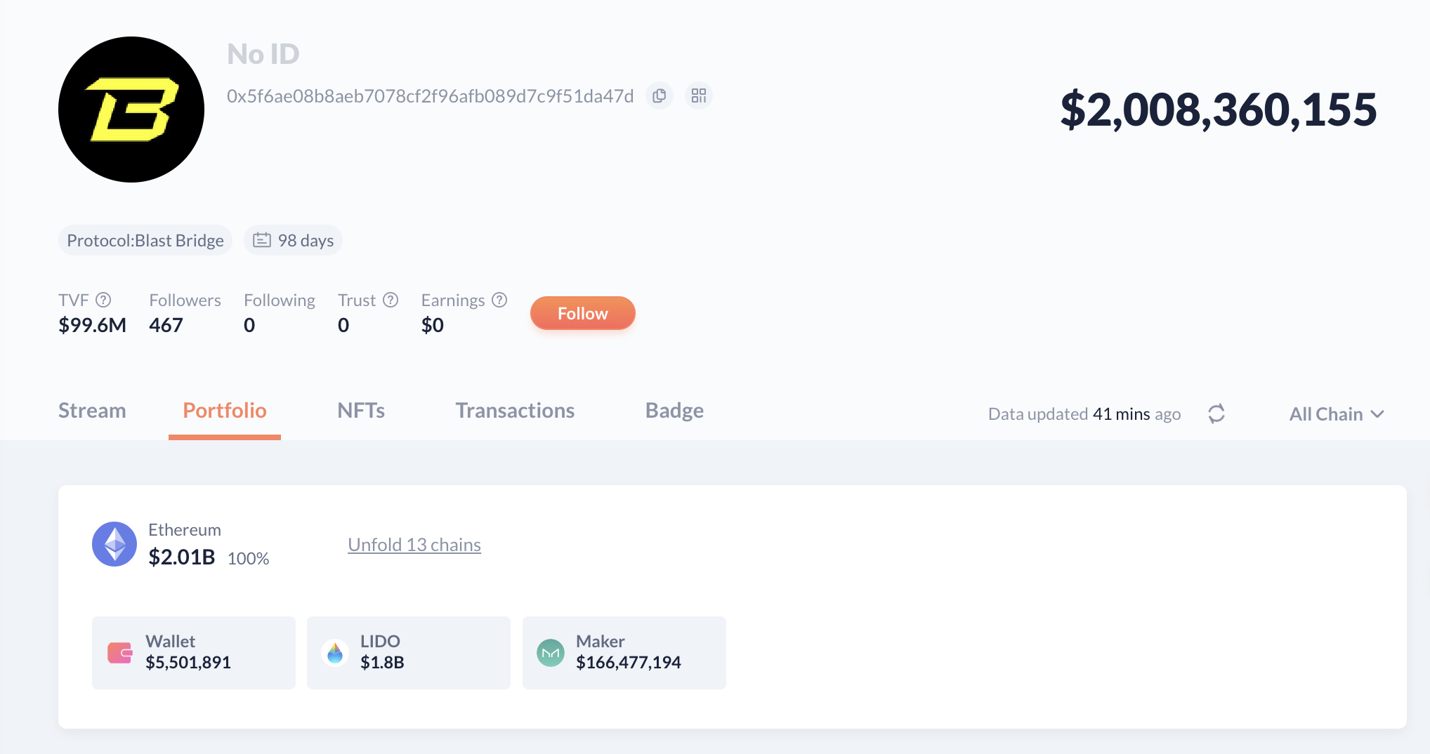 深潮 TechFlow 消息,据 DeBank 数据显示,Layer 2 网络 Blast 合约地址持有资产总价值突破 20 亿美元,暂报 2,008,360,155 美元。