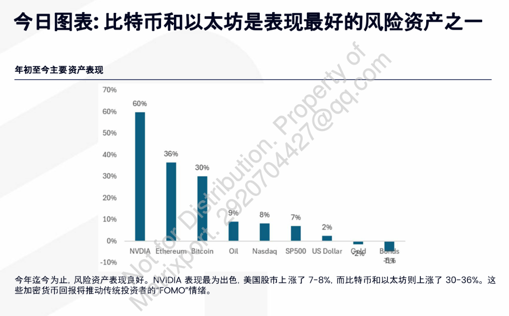 深潮 TechFlow 消息,Matrixport 报告指出,今年迄今为止,风险资产表现良好。比特币和以太坊上涨了 30-36%,为表现最好的风险资产之一。这些加密货币回报将推动传统投资者的“FOMO”情绪。