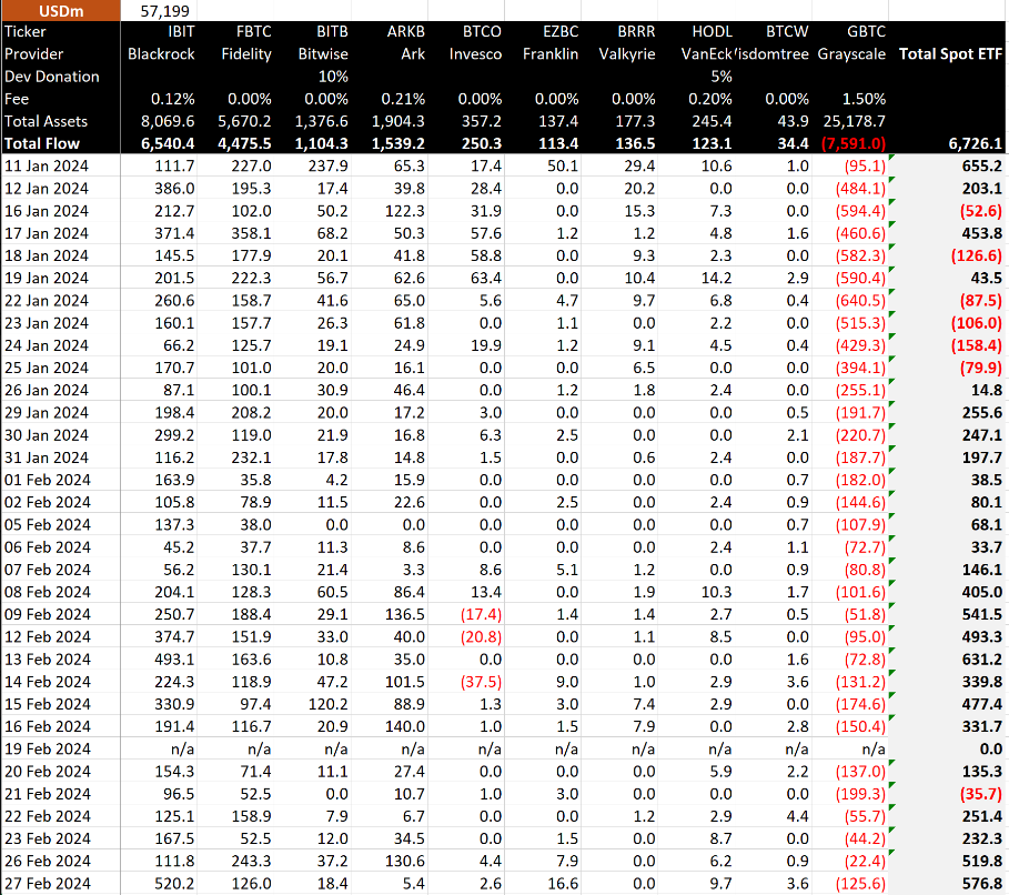 深潮 TechFlow 消息,据BitMEX Research数据显示,2 月 27 日比特币现货ETF净流入 5.768 亿美元。仅 Blackrock 就有 5.2 亿美元(10,167.5 BTC)的流入 。