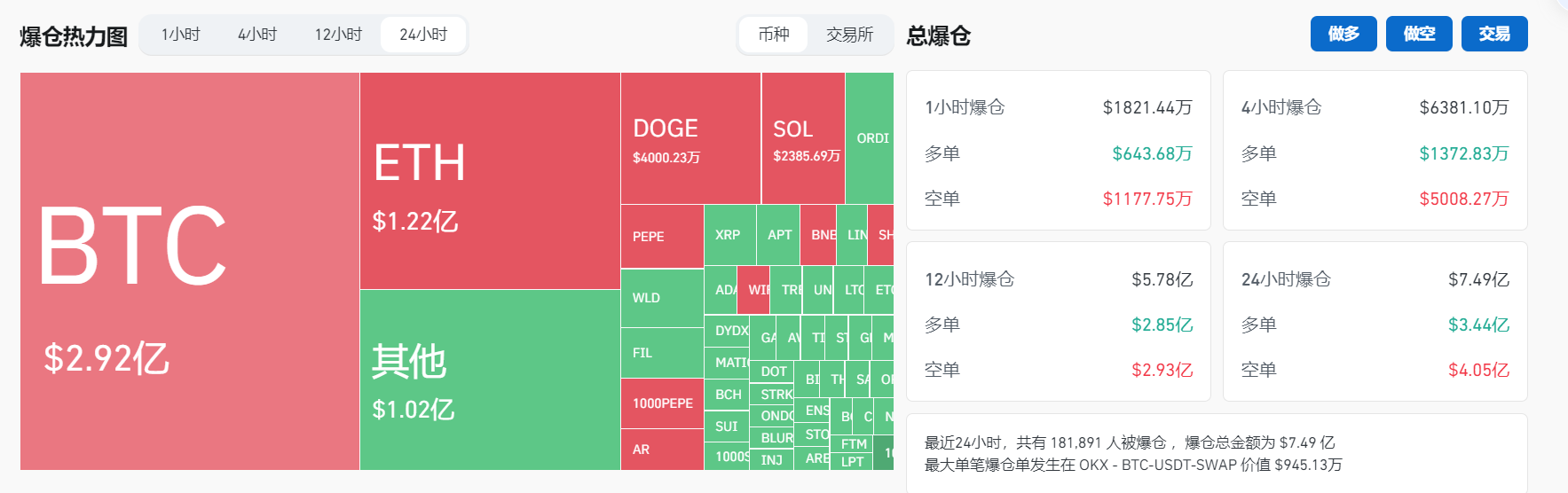 过去24小时全网爆仓7.49亿美元,空单爆仓 4.05 亿美元