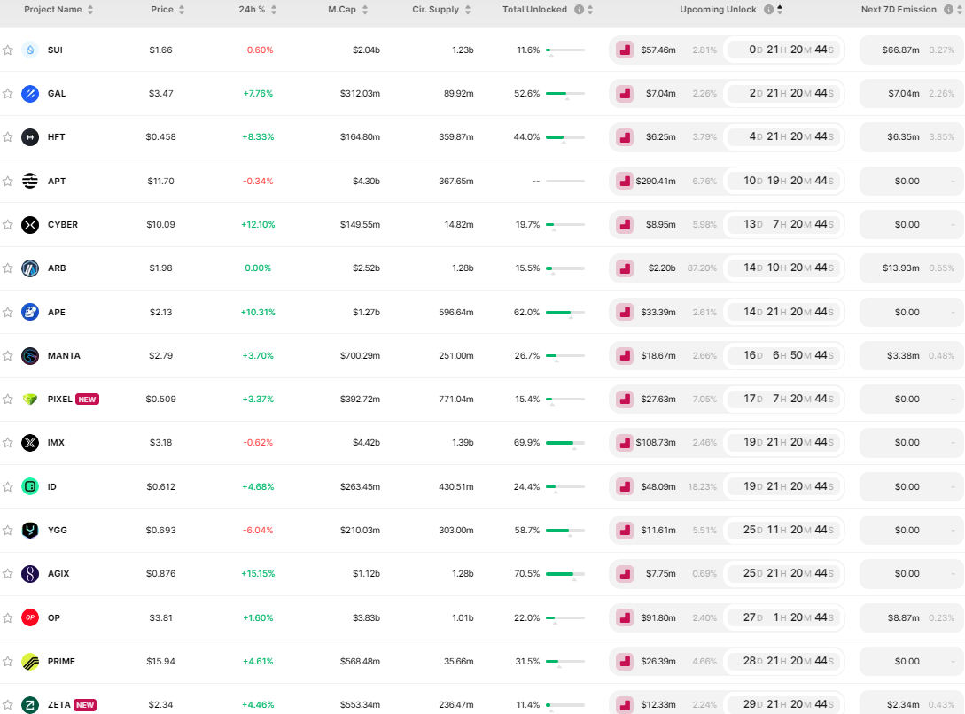 • SUI 将于 3 月 3 日 16:00 解锁 3462万枚代币,价值约 5746万美元,占流通供应量的2.81%;