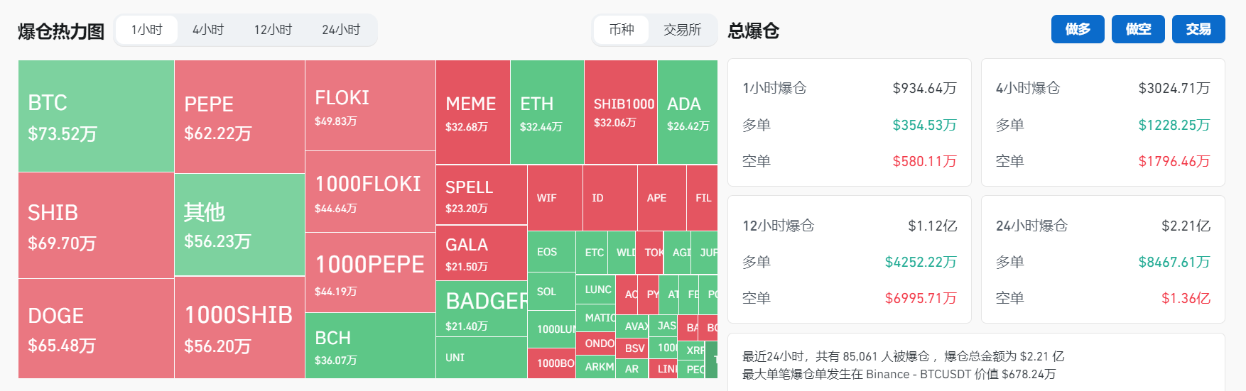 SHIB、DOGE、PEPE、FLOKI等meme币爆仓数量均超过ETH,SHIB爆仓69.7万美元,DOGE爆仓65.48万美元,PEPE爆仓62.22万美元,FLOKI爆仓49.83万美元,ETH爆仓32.44万美元。