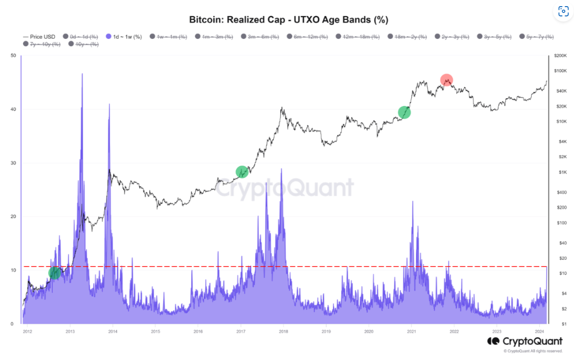 深潮 TechFlow 消息,据CryptoQuant用户MAC_D披露数据显示,1天至1周投资者的比例已跃升至10.62%,与上一轮牛市反弹初期的20年10月或高峰期的21年10月至11月相似。